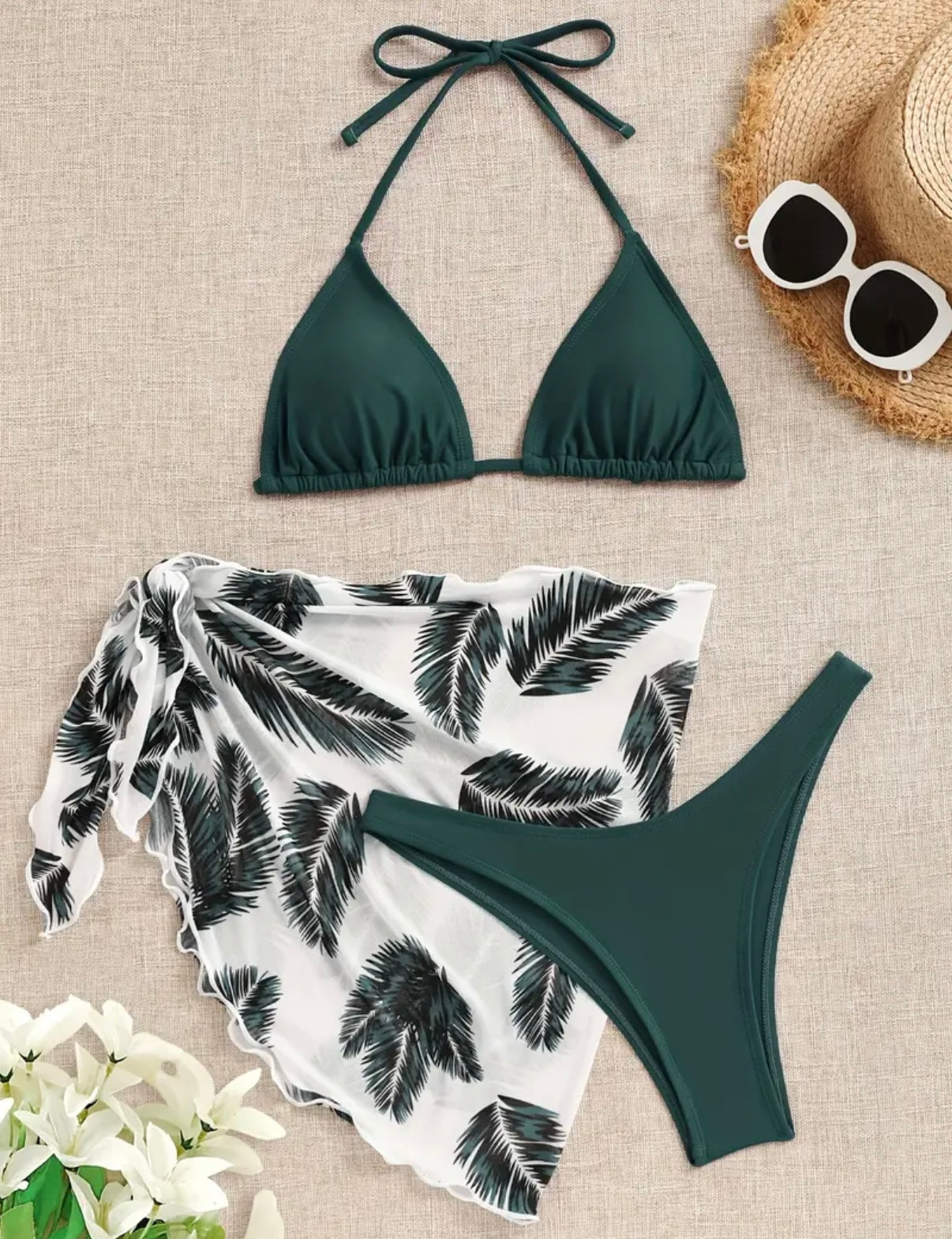 Un ensemble 3 pièces qui sera vous mettre en valeur avec sa coupe sexy et chic composé d'un maillot deux pièces & son petit paréo chic et léger .